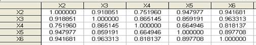 计算各解释变量的相关系数,选择X2、X3、X4、X5、X6数据,点”view/correlations”得相关系数矩阵(如表3-3):